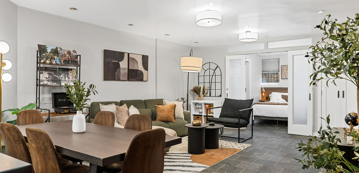 A stylish 2-bedroom, 2-bathroom apartment that blends New York–inspired design with historic character in the heart of Downtown San Diego. Walk to Gaslamp Quarter, Petco Park, the Convention Center and Balboa Park, then come back to a sleek kitchen, cozy sectional and smart TVs for a relaxed night in.